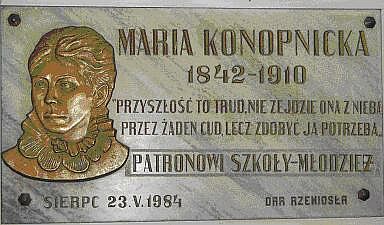 Konopnicka Maria, z Wasiłowskich (1842-1910), polska poetka, prozaik, krytyk, publicystka. Uczyła się krótko na pensji sióstr sakramentek w Warszawie, przez całe życie dokształcała się we własnym zakresie. Wychowywała 6 dzieci, utrzymując się z dochodów niewielkiego dzierżawionego folwarku. W latach 1877-1890 mieszkała w Warszawie. Od 1884 do 1886 roku redagowała pismo dla kobiet "Świt".